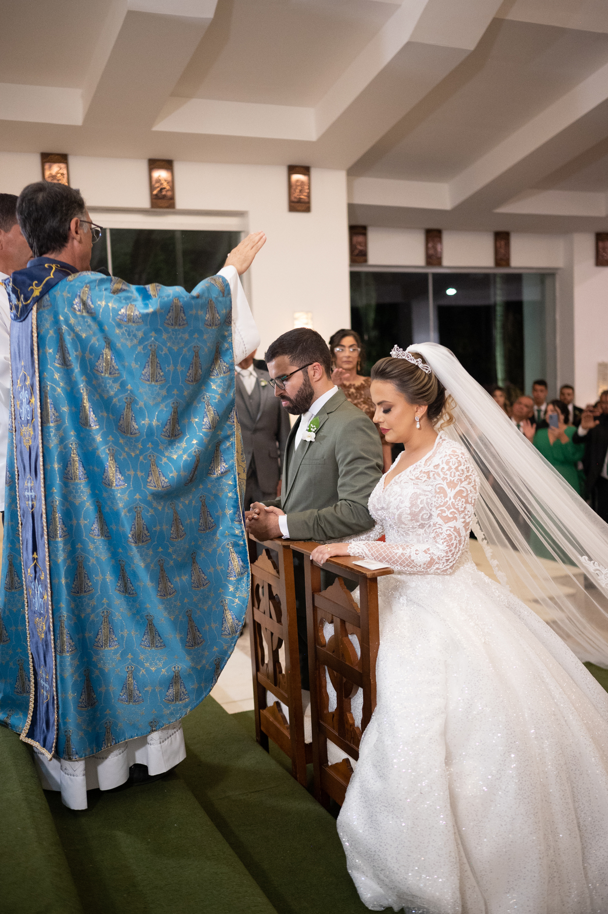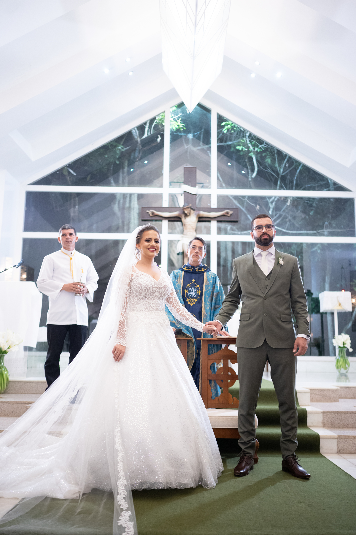 A noiva parecia deslumbrante em seu vestido branco, com um longo véu que flutuava delicadamente no vento. Seus cabelos estavam presos em um penteado elegante, e ela usava brincos de pérolas que combinavam com sua personalidade delicada. Markus, por sua vez, estava elegante em seu terno verde. Seu sorriso era largo e sincero, e seus olhos brilhavam de alegria.
